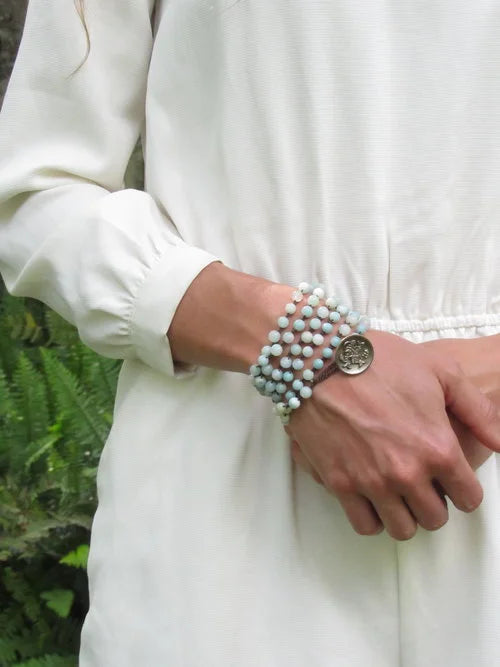 Soft, pale blues of this mid size amazonite stone are crocheted closely together on chocolate brown cording for a subtle hint of color. Wear as a choker or wrapped around the wrist 5-6 times for a more layered look.
